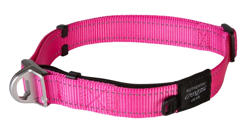De Rogz Beltz Utility halsband Safety is een duurzame nylon halsband die speciaal is ontwikkeld voor de veiligheid van je hond. De magneetsluiting met twee gespen zal zich openen als bijvoorbeeld bij het spelen met een andere hond te uitbundig wordt getrokken of als de halsband ergens aan blijft hangen. Als de sluiting zich opent, zal het elastiek (dat achter de sluiting zit) ruim uitrekken zodat je hond veilig kan ontsnappen.