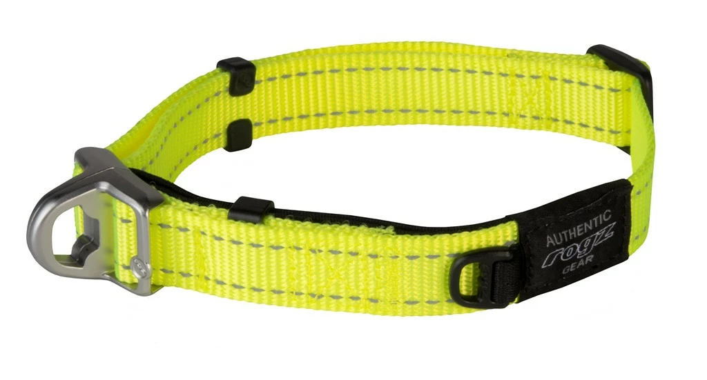 De Rogz Beltz Utility halsband Safety is een duurzame nylon halsband die speciaal is ontwikkeld voor de veiligheid van je hond. De magneetsluiting met twee gespen zal zich openen als bijvoorbeeld bij het spelen met een andere hond te uitbundig wordt getrokken of als de halsband ergens aan blijft hangen. Als de sluiting zich opent, zal het elastiek (dat achter de sluiting zit) ruim uitrekken zodat je hond veilig kan ontsnappen.
