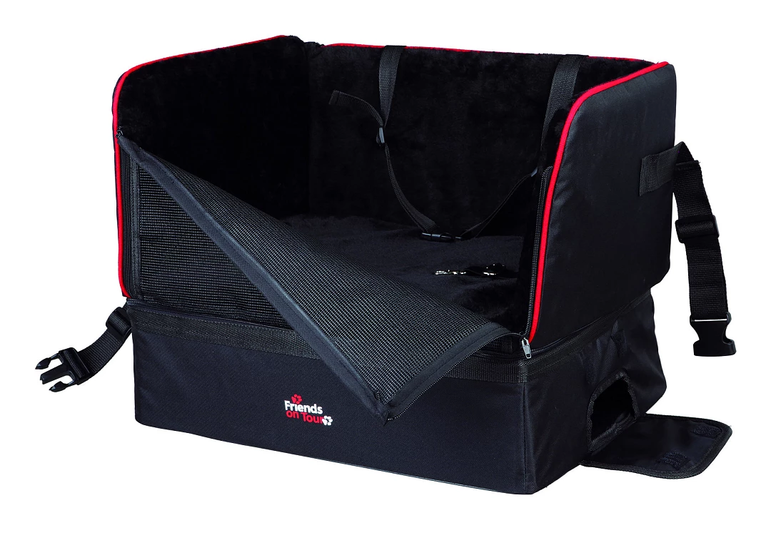 Met bevestigingsgordels voor het vastzetten van de stoel in het voertuig. Het opbergvak dient ook als zitverhoging waardoor de hond naar buiten kan kijken. De stoel zit heel zacht en comfortabel en is daarmee ook voor lange ritten geschikt.