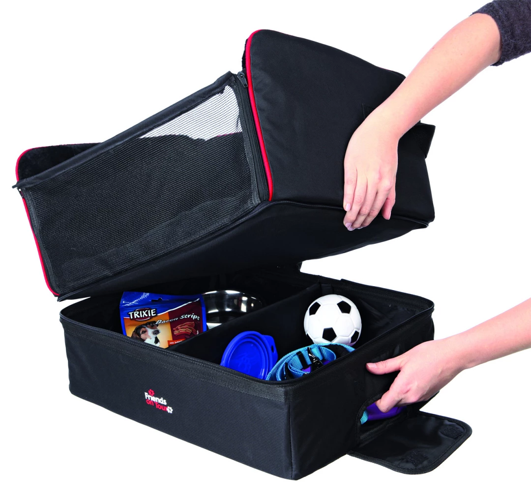 In de stoel is ook een uitsparing aanwezig voor de autogordel van de hond en de geïntegreerde riem voorkomt dat de hond eruit springt. Het autozitje is compact op te bergen.
